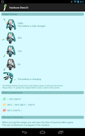 はちゅねでんちは、バッテリーに負担をかけない省エネ設計(はちゅね星を除く)になっているため、表示の更新が遅れる場合があります。また、タスク削除系のソフトが動作している場合は競合して上手に作動しない場合もあります。その他Android向けの初音ミク関連アプリには初音ミクのリップシンクゲームや初音ミクがホーム画面で時間を読み上げてくれるVoiceClock -Miku-などがあるので、この機会にそろえてみてはいかがでしょうか。はちゅねでんちは、初音ミクのデフォルメキャラであるはちゅねミクがバッテリー残量を知らせてくれるバッテリーメーターウィジェットです。はちゅね星での育成に夢中になって、電池を消費しすぎないよう注意してくださいね。